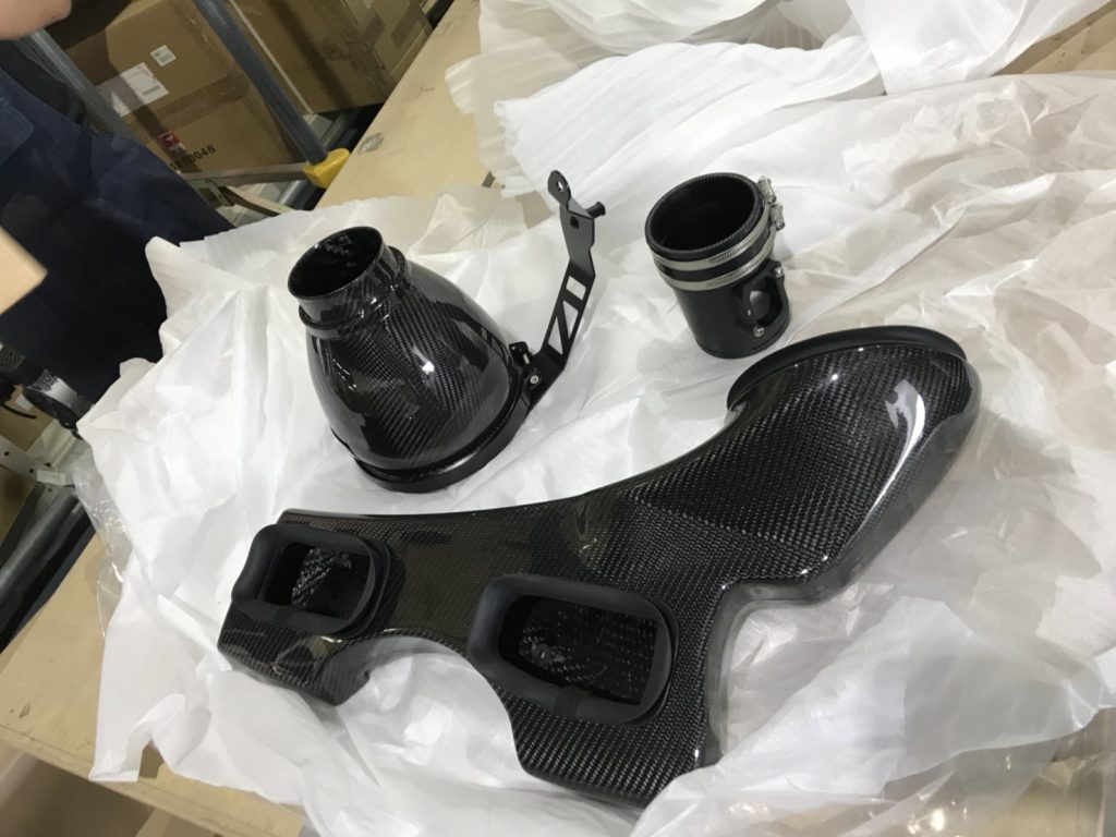 インテークキット内容:カーボンボンネットスクープ、カーボンインテークダクト、カーボンフィルターハウジング、エアフィルター、MAFチューブと付属品。