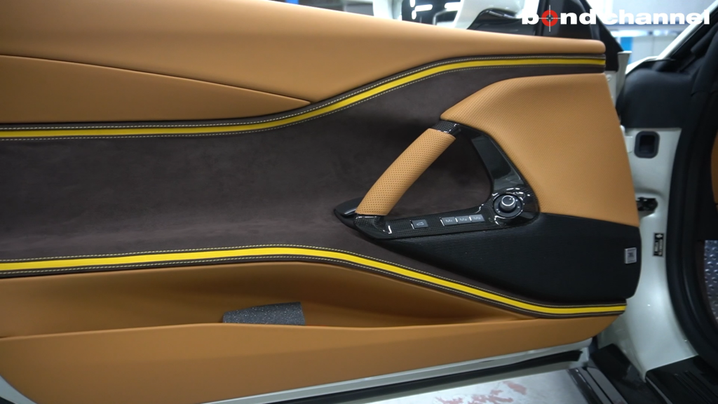 茶色とベージュのレザーとアルカンに、黄色のアクセント。それにカーボンパーツ満載。普通スポーツ路線か高級路線、どっちかに振らないとバランスが崩れそうですがこの車は全てがマッチしています。