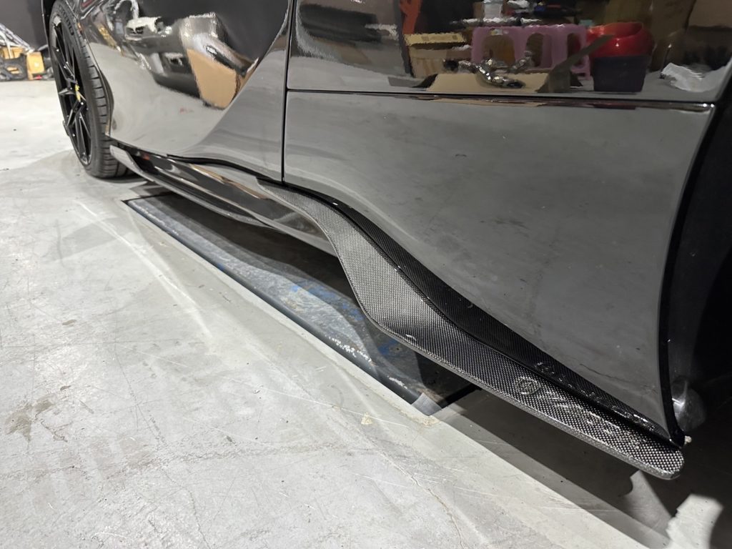 前後フェンダーに繋がる巨大なサイドスカートやリアディフューザーにはさらに多くのカーボン遇らわれ普通じゃない雰囲気がプンプン